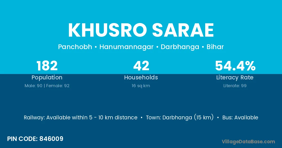 Darbhanga (15 km) is the nearest town to Khusro Sarae village for major economic activities and is located approximately 15 km away.