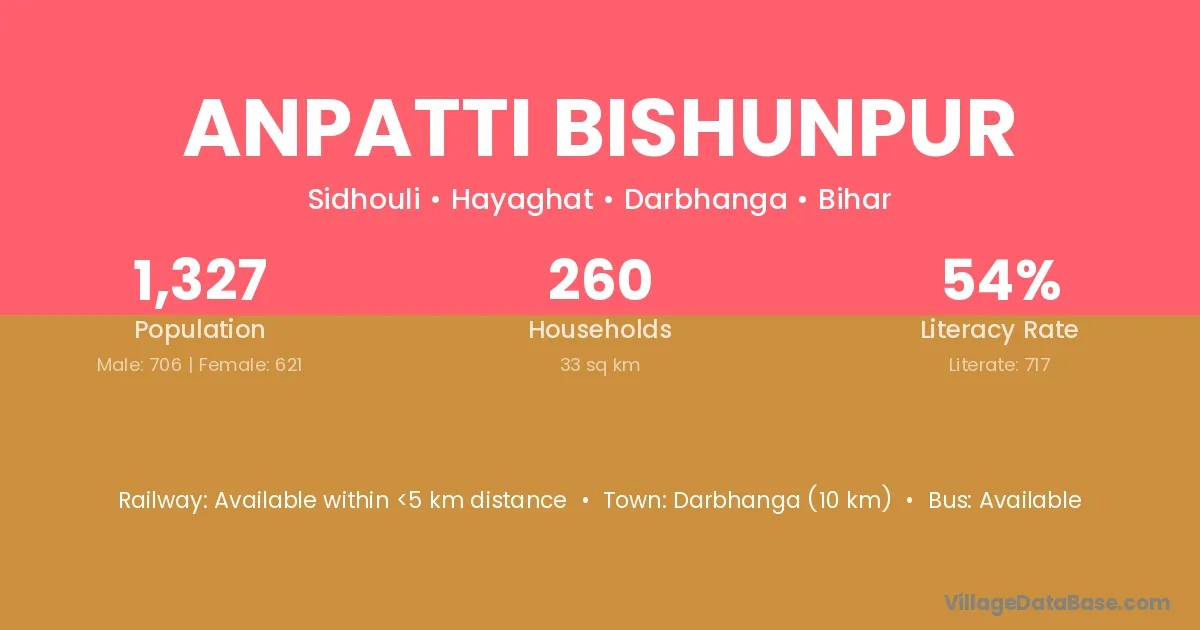 Anpatti Bishunpur village has a total population of 1,327 people, of which 706 are males and 621 are females.