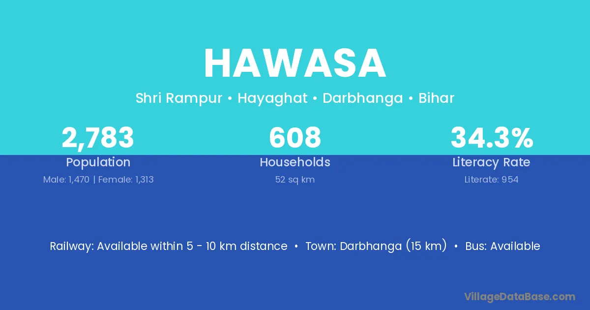 Darbhanga (15 km) is the nearest town to Hawasa village for major economic activities and is located approximately 15 km away.