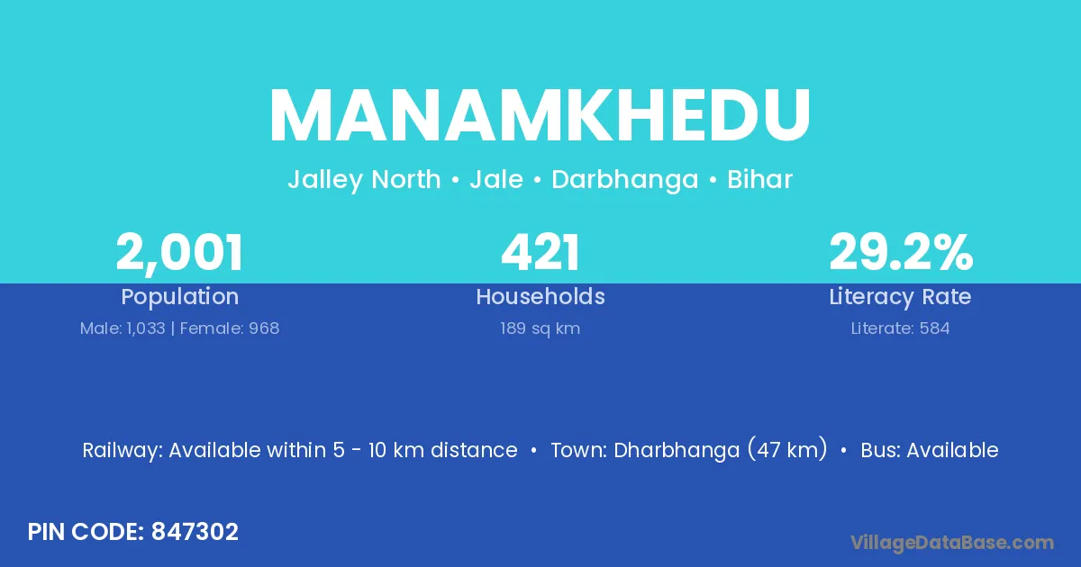 Dharbhanga (47 km) is the nearest town to Manamkhedu village for major economic activities and is located approximately 47 km away.