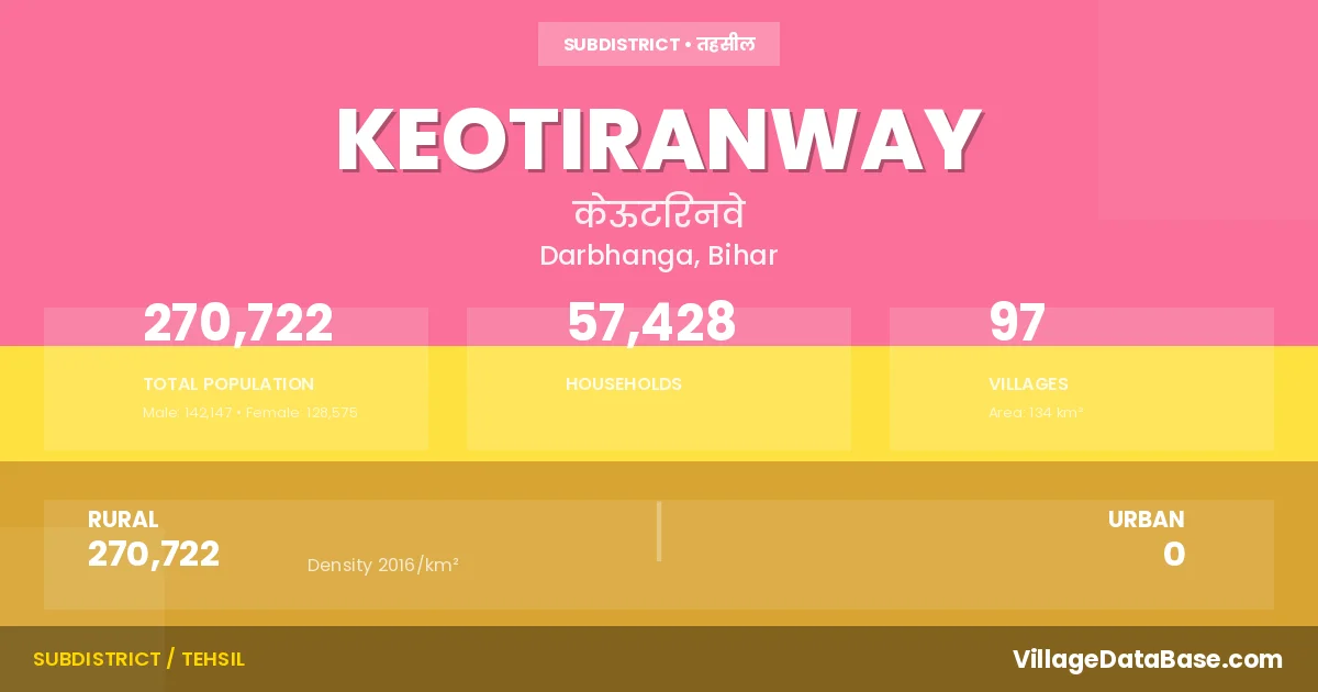 Keotiranway is a town and Subdivision in the Darbhanga district of the Bihar. In India, a Subdivision is a subdivision of a district responsible for the administration and revenue collection of a specific area within the district. Subdivisions play a crucial role in the local governance structure, contributing significantly to the development and administration of their communities.