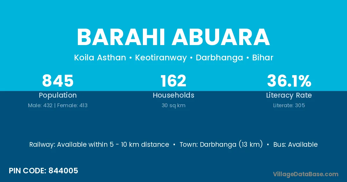 Darbhanga (13 km) is the nearest town to Barahi Abuara village for major economic activities and is located approximately 13 km away.