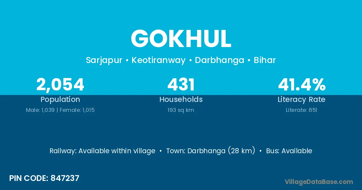 Darbhanga (28 km) is the nearest town to Gokhul village for major economic activities and is located approximately 28 km away.