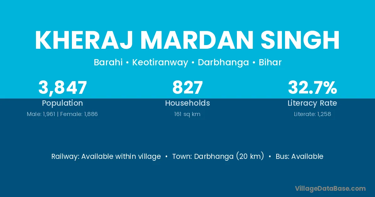 Darbhanga (20 km) is the nearest town to Kheraj Mardan Singh village for major economic activities and is located approximately 20 km away.