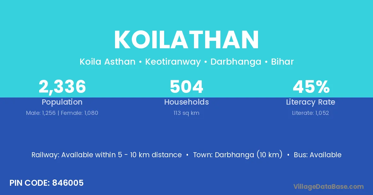 Darbhanga (10 km) is the nearest town to Koilathan village for major economic activities and is located approximately 10 km away.