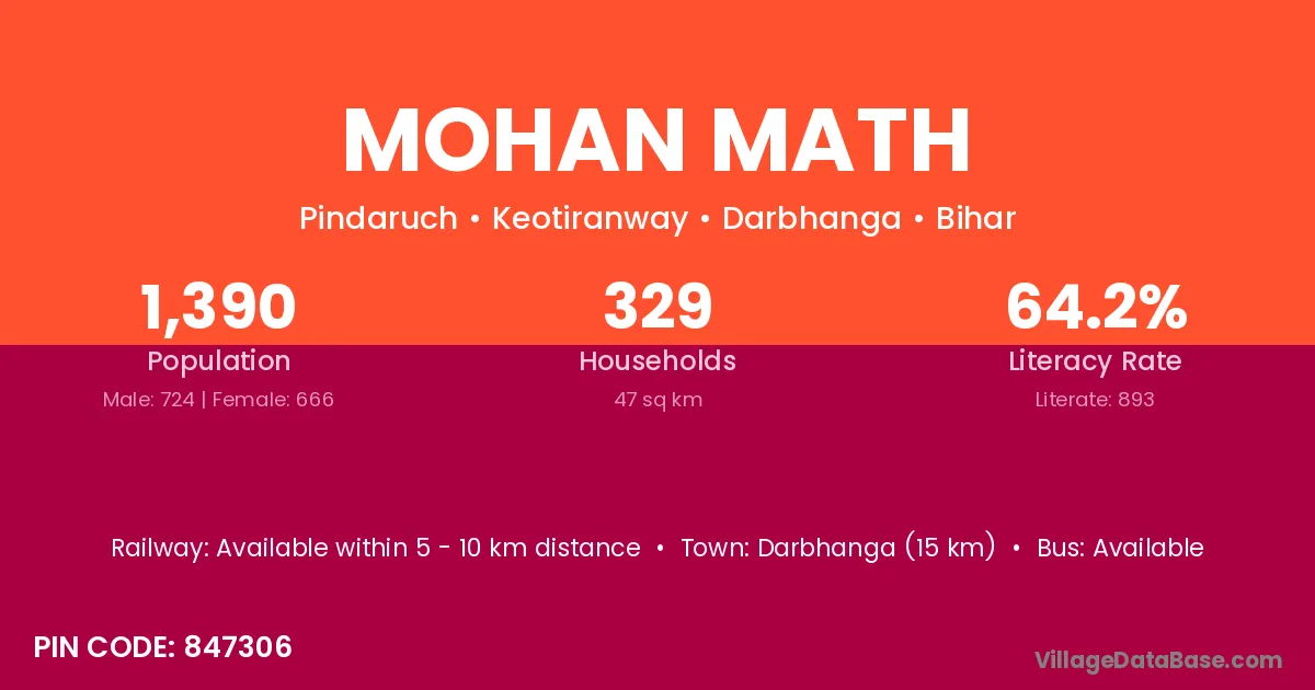 Darbhanga (15 km) is the nearest town to Mohan Math village for major economic activities and is located approximately 15 km away.
