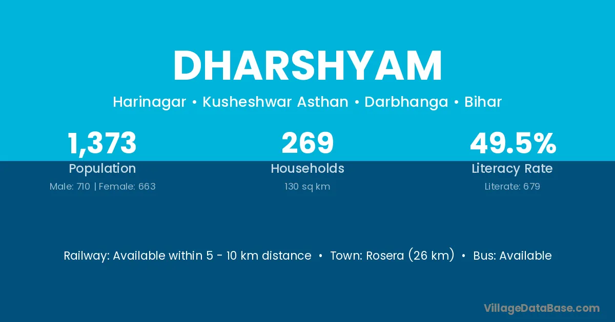 Rosera (26 km) is the nearest town to Dharshyam village for major economic activities and is located approximately 26 km away.