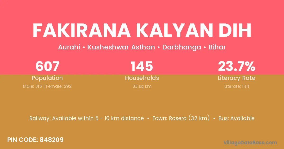 Rosera (32 km) is the nearest town to Fakirana Kalyan Dih village for major economic activities and is located approximately 32 km away.