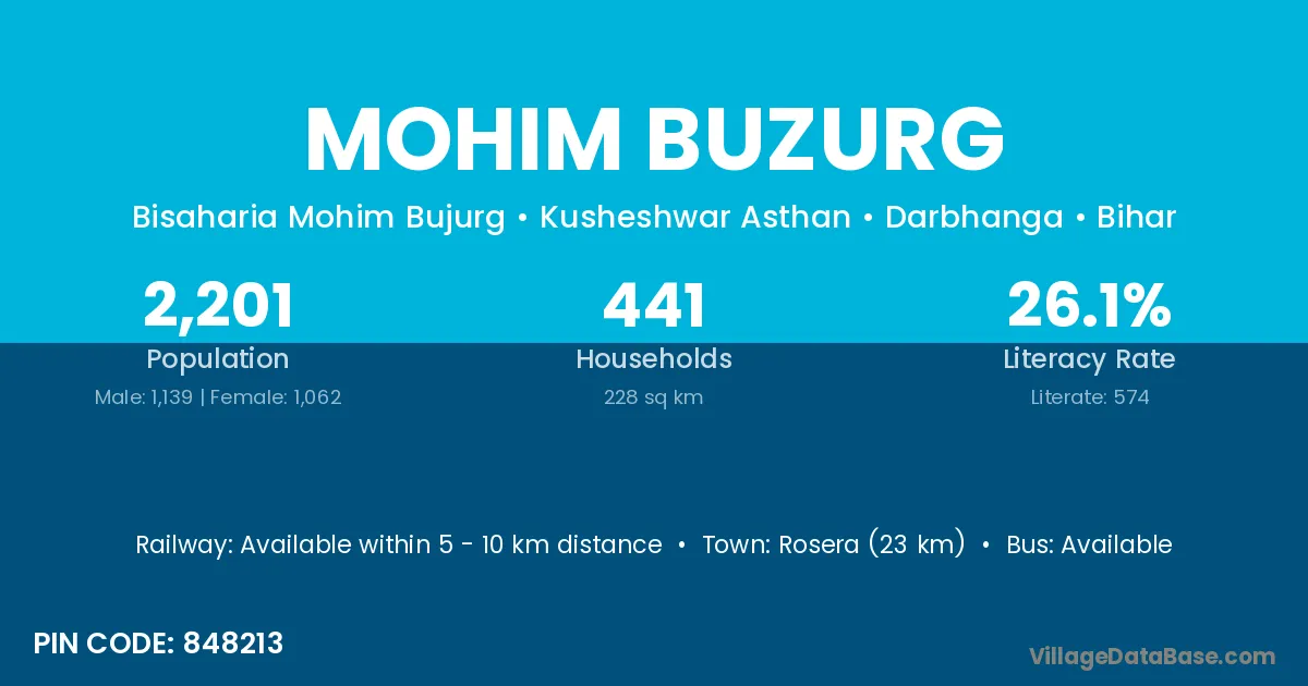 Rosera (23 km) is the nearest town to Mohim Buzurg village for major economic activities and is located approximately 23 km away.