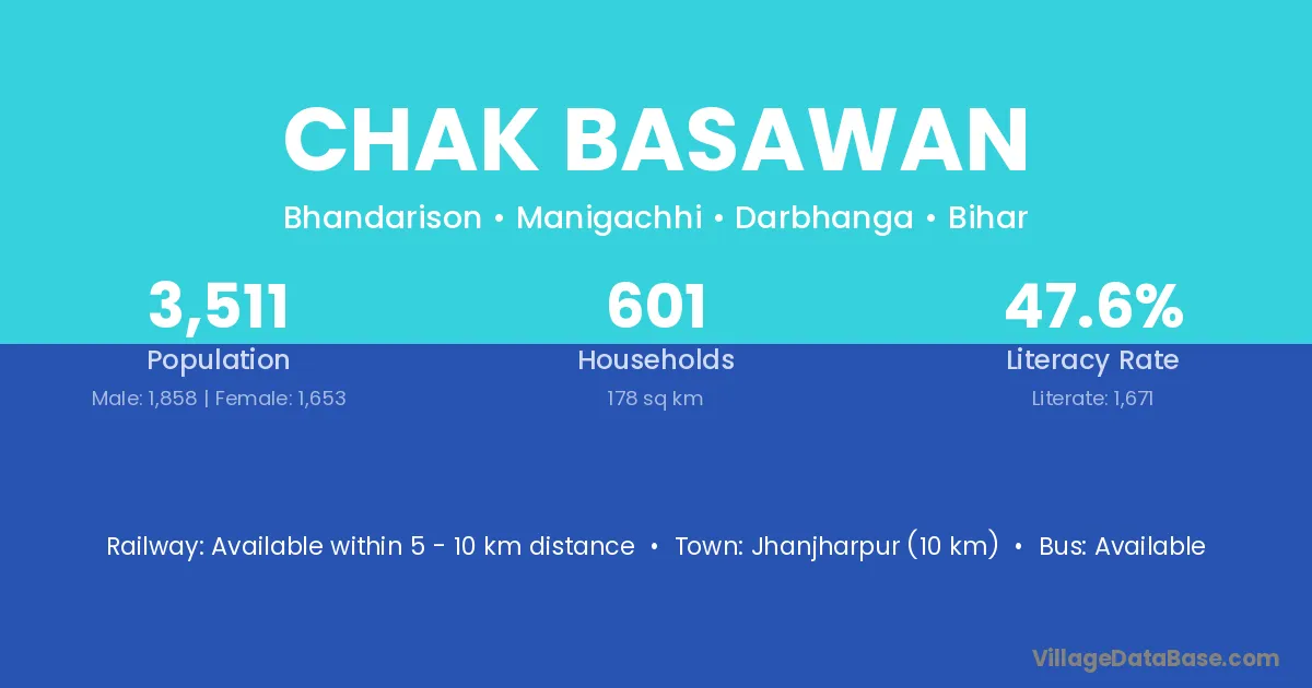 Jhanjharpur (10 km) is the nearest town to Chak Basawan village for major economic activities and is located approximately 10 km away.