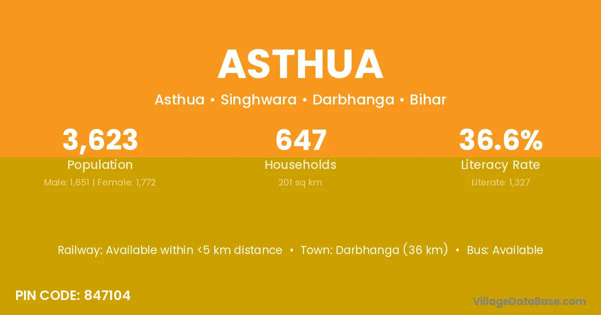 Darbhanga (36 km) is the nearest town to Asthua village for major economic activities and is located approximately 36 km away.