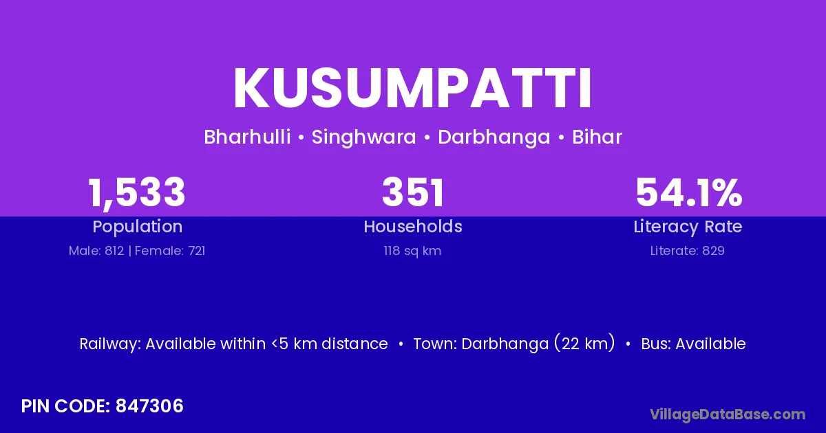 Darbhanga (22 km) is the nearest town to Kusumpatti village for major economic activities and is located approximately 22 km away.
