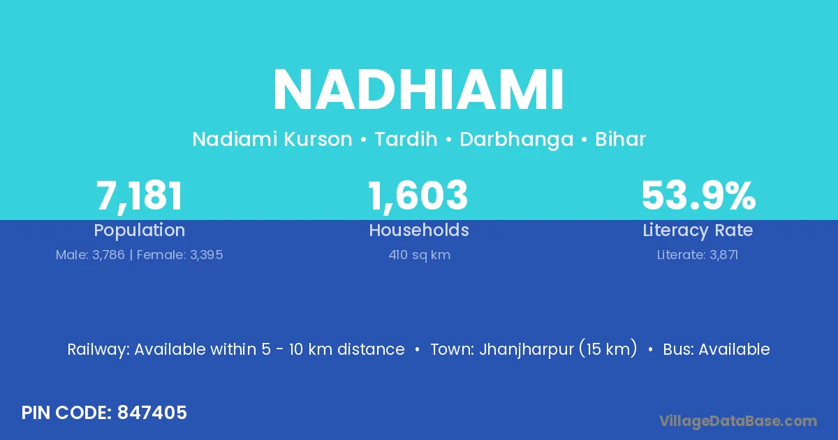 Jhanjharpur (15 km) is the nearest town to Nadhiami village for major economic activities and is located approximately 15 km away.