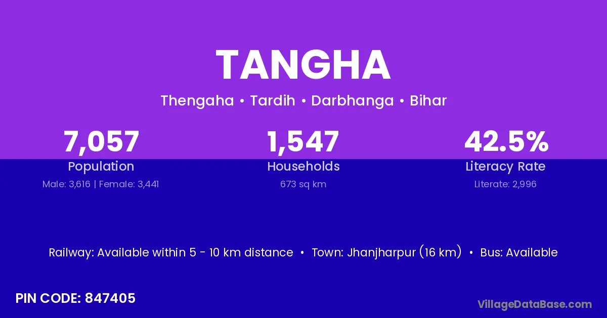 Jhanjharpur (16 km) is the nearest town to Tangha village for major economic activities and is located approximately 16 km away.