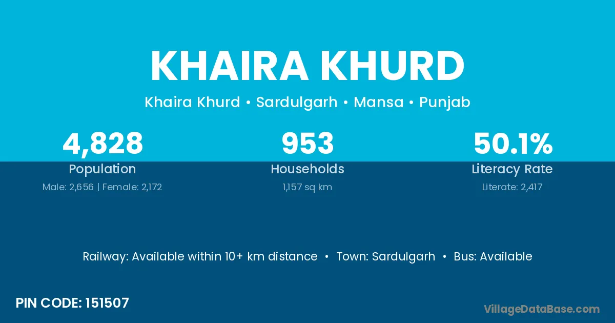 Khaira Khurd village has a total population of 827 people, of which 425 are males and 402 are females.