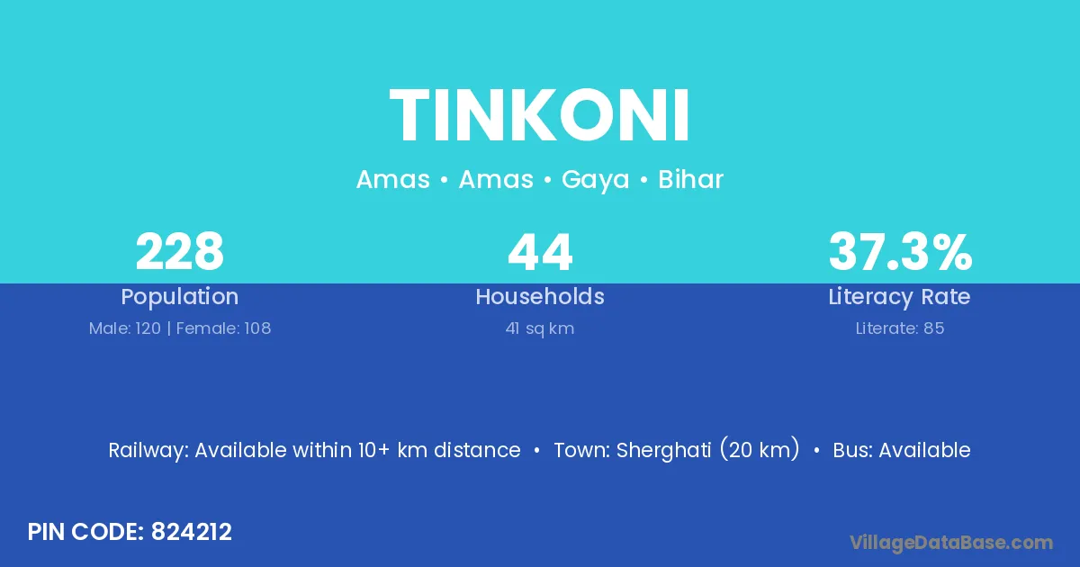 Sherghati (20 km) is the nearest town to Tinkoni village for major economic activities and is located approximately 20 km away.