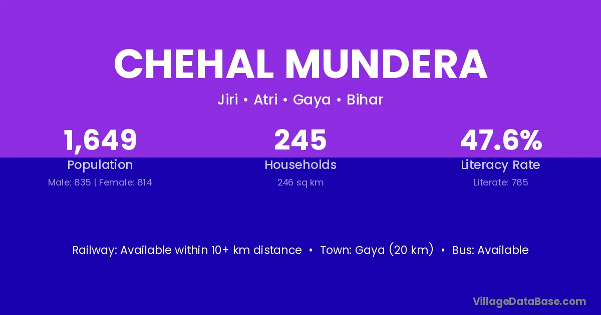 Gaya (20 km) is the nearest town to Chehal Mundera village for major economic activities and is located approximately 20 km away.