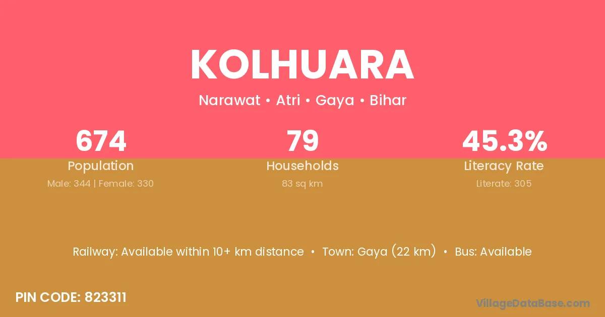 Gaya (22 km) is the nearest town to Kolhuara village for major economic activities and is located approximately 22 km away.