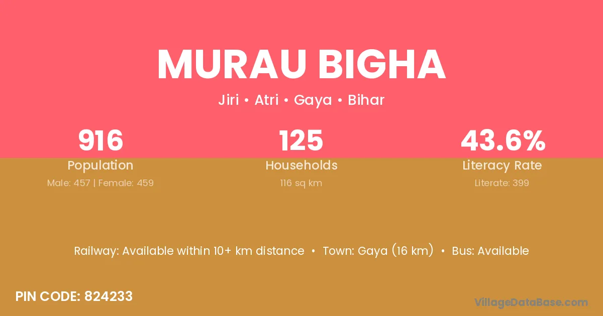 Murau Bigha village has a total population of 916 people, of which 457 are males and 459 are females.