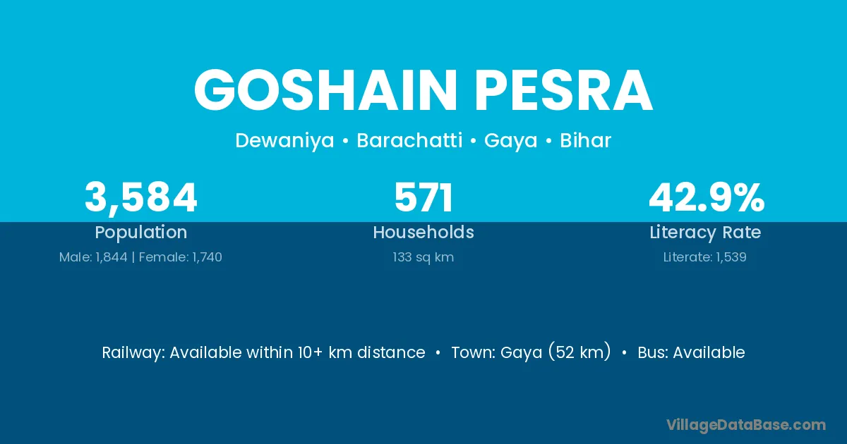 Gaya (52 km) is the nearest town to Goshain Pesra village for major economic activities and is located approximately 52 km away.