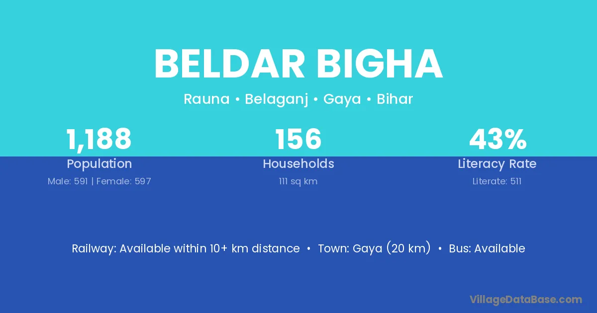Gaya (20 km) is the nearest town to Beldar Bigha village for major economic activities and is located approximately 20 km away.