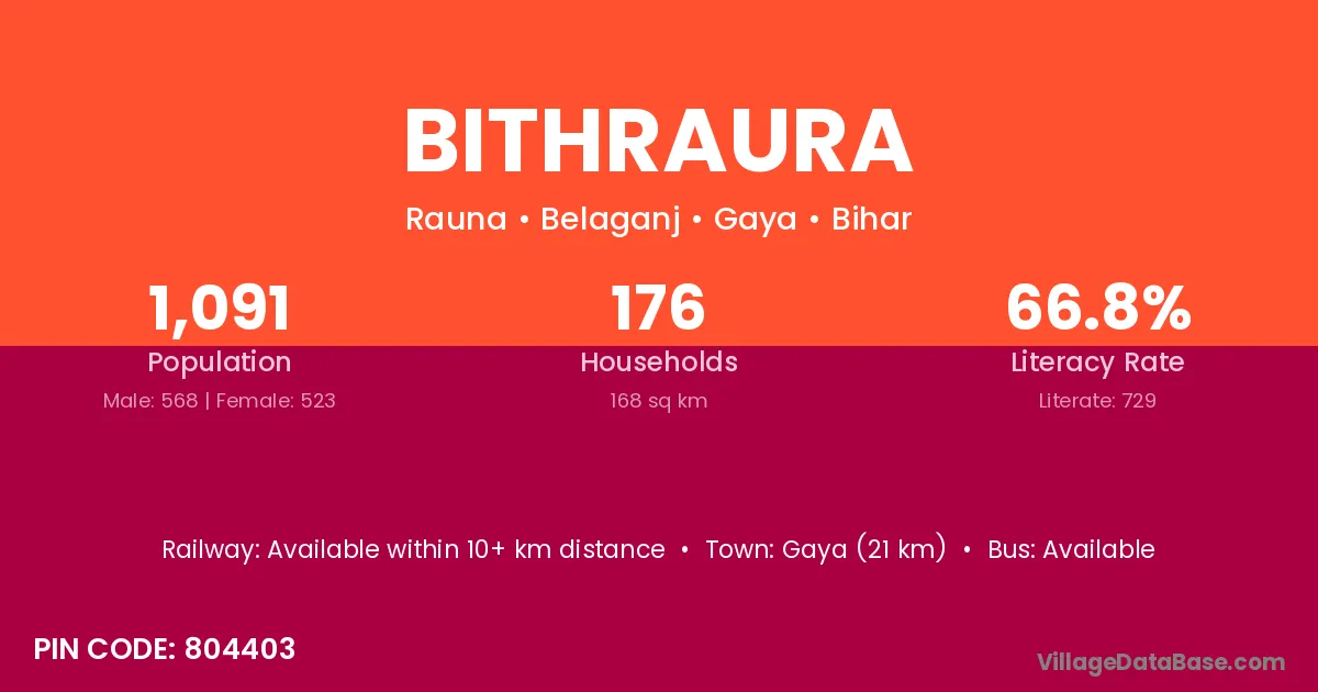 Gaya (21 km) is the nearest town to Bithraura village for major economic activities and is located approximately 21 km away.