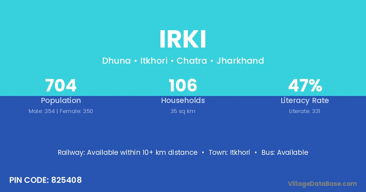 The literacy rate of Irki village is 51.20%. Male literacy stands at 59.03% and female literacy at 42.76%.