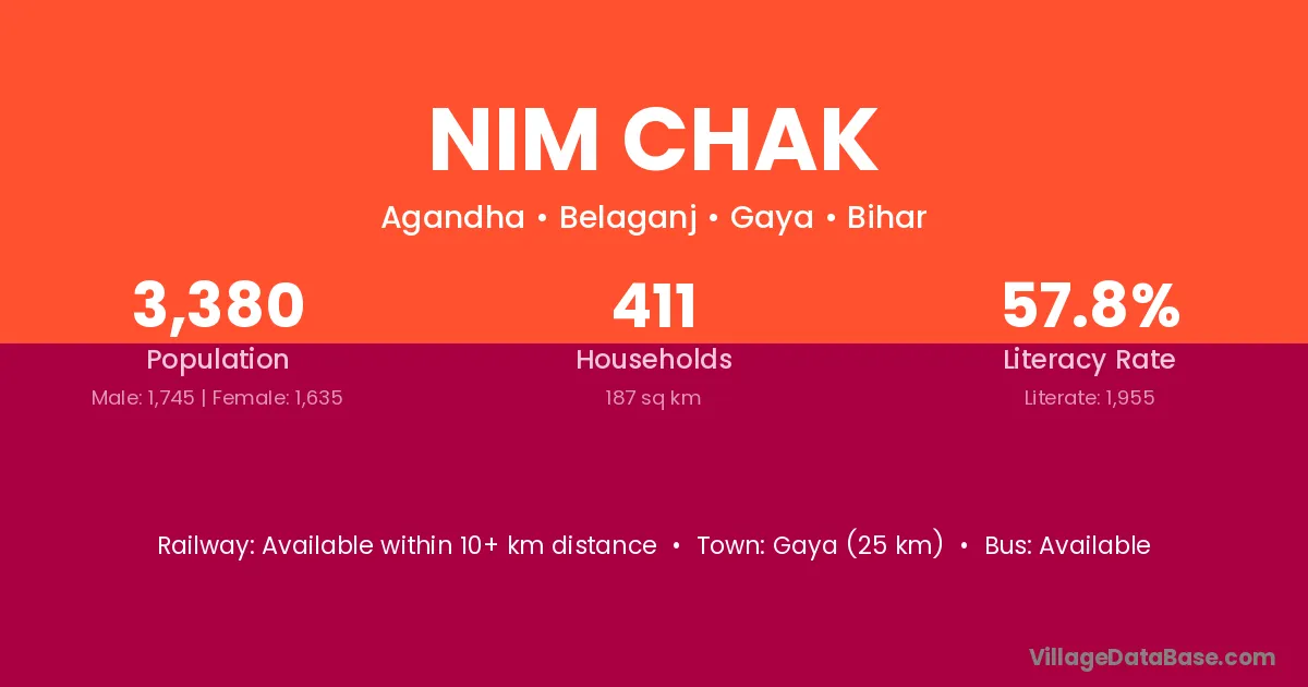 Gaya (25 km) is the nearest town to Nim Chak village for major economic activities and is located approximately 25 km away.