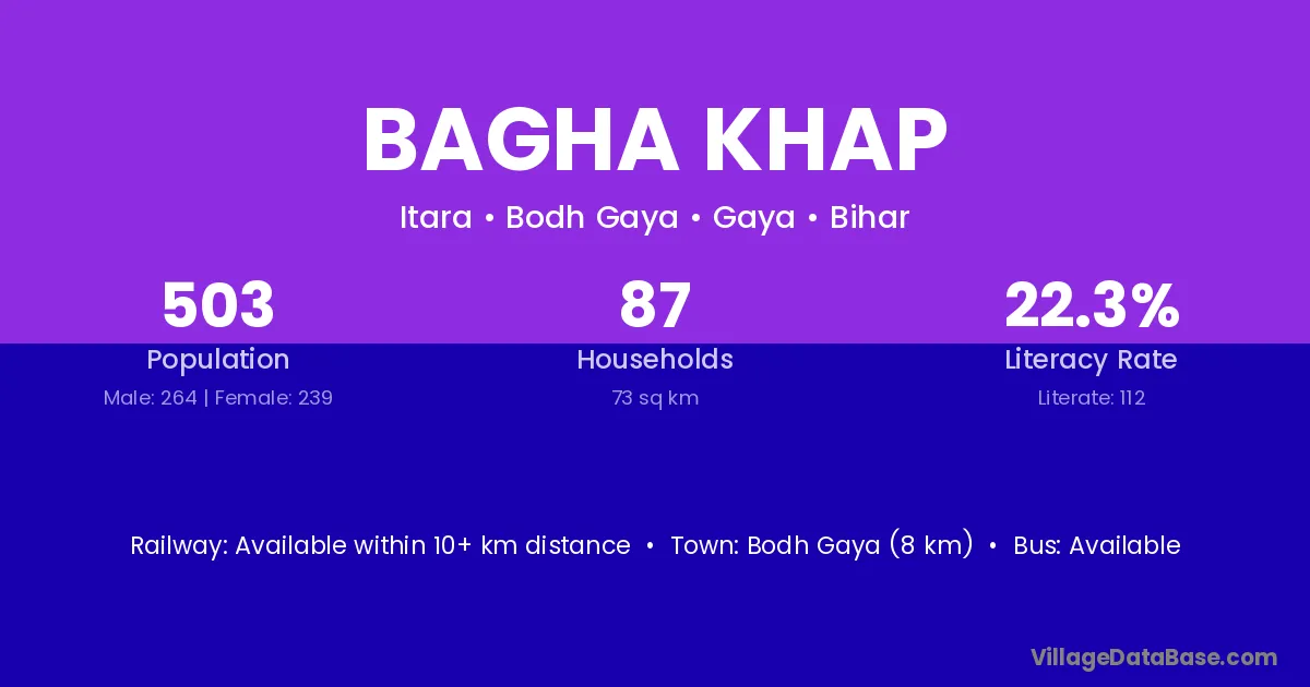 Bodh Gaya (8 km) is the nearest town to Bagha Khap village for major economic activities and is located approximately 8 km away.