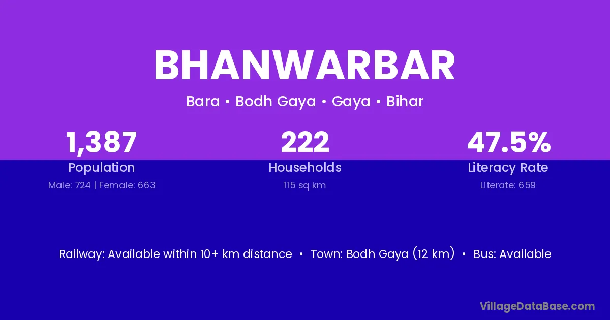 Bodh Gaya (12 km) is the nearest town to Bhanwarbar village for major economic activities and is located approximately 12 km away.