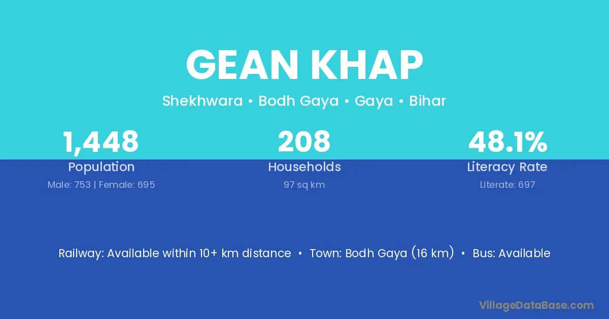 Bodh Gaya (16 km) is the nearest town to Gean Khap village for major economic activities and is located approximately 16 km away.