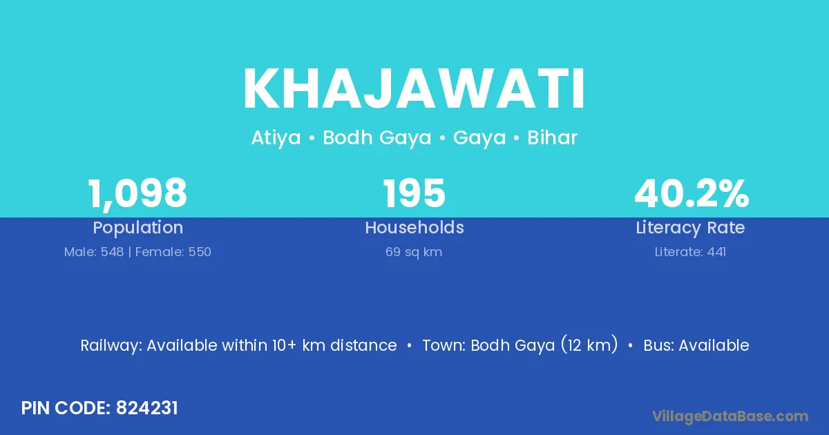 Bodh Gaya (12 km) is the nearest town to Khajawati village for major economic activities and is located approximately 12 km away.