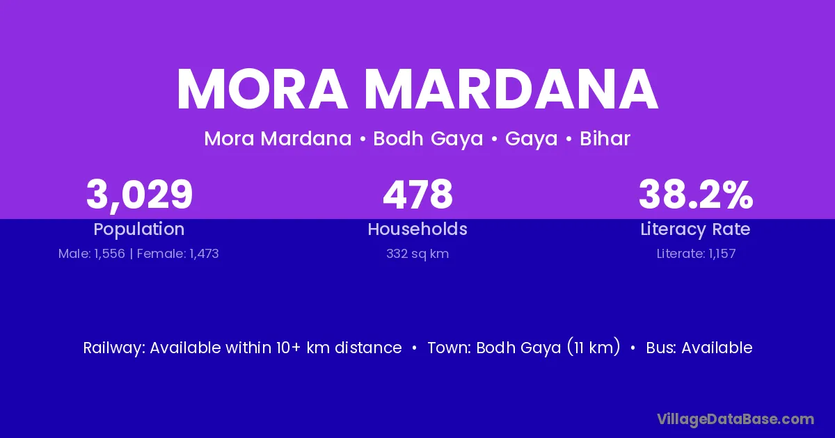 Bodh Gaya (11 km) is the nearest town to Mora Mardana village for major economic activities and is located approximately 11 km away.