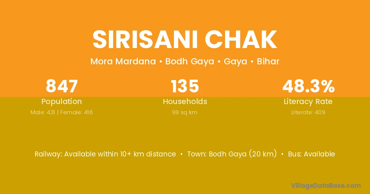 Bodh Gaya (20 km) is the nearest town to Sirisani Chak village for major economic activities and is located approximately 20 km away.