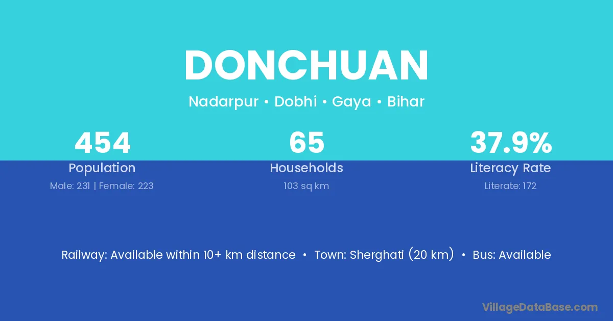 Sherghati (20 km) is the nearest town to Donchuan village for major economic activities and is located approximately 20 km away.