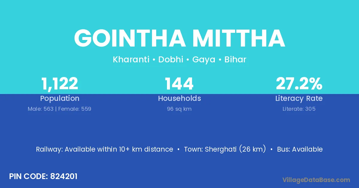 Sherghati (26 km) is the nearest town to Gointha Mittha village for major economic activities and is located approximately 26 km away.