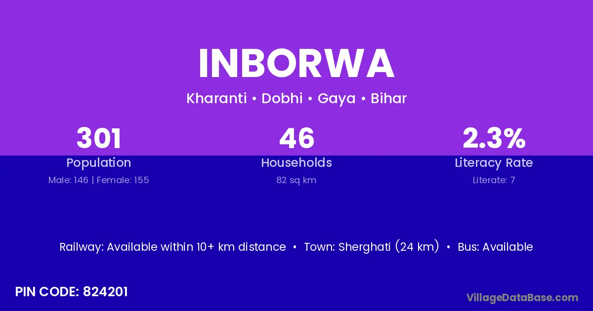 Sherghati (24 km) is the nearest town to Inborwa village for major economic activities and is located approximately 24 km away.