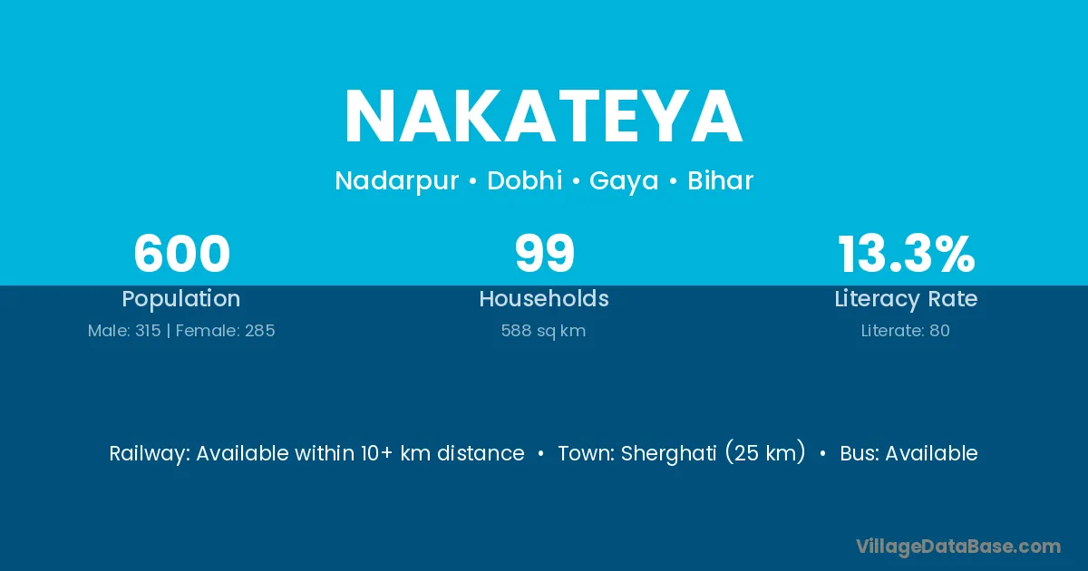 Sherghati (25 km) is the nearest town to Nakateya village for major economic activities and is located approximately 25 km away.