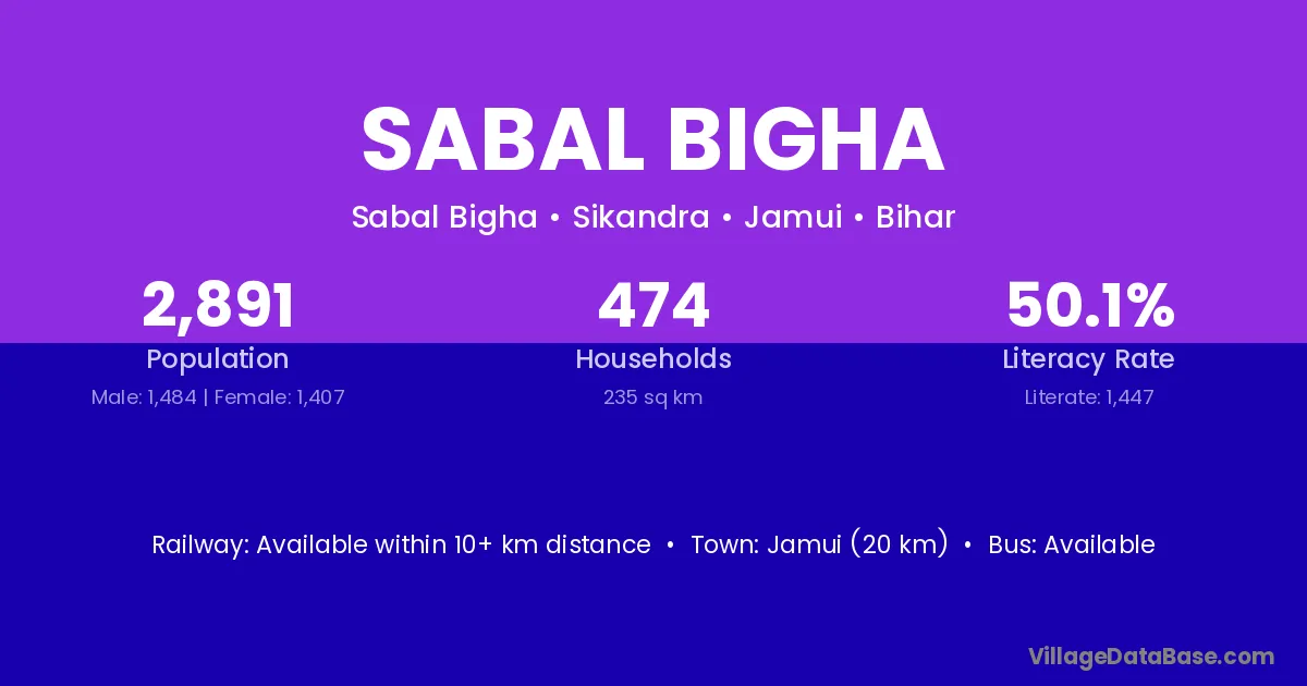 The literacy rate of Sabal Bigha village is 44.77%. Male literacy stands at 50.87% and female literacy at 38.49%.