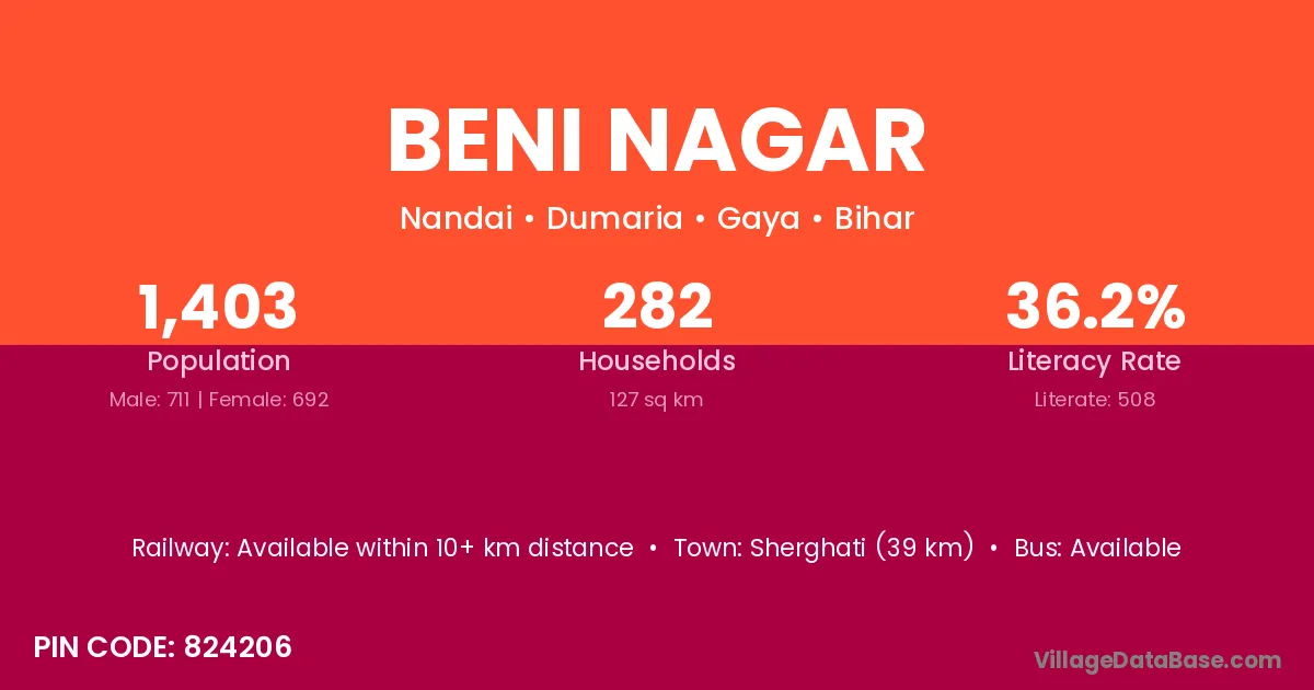 Sherghati (39 km) is the nearest town to Beni Nagar village for major economic activities and is located approximately 39 km away.
