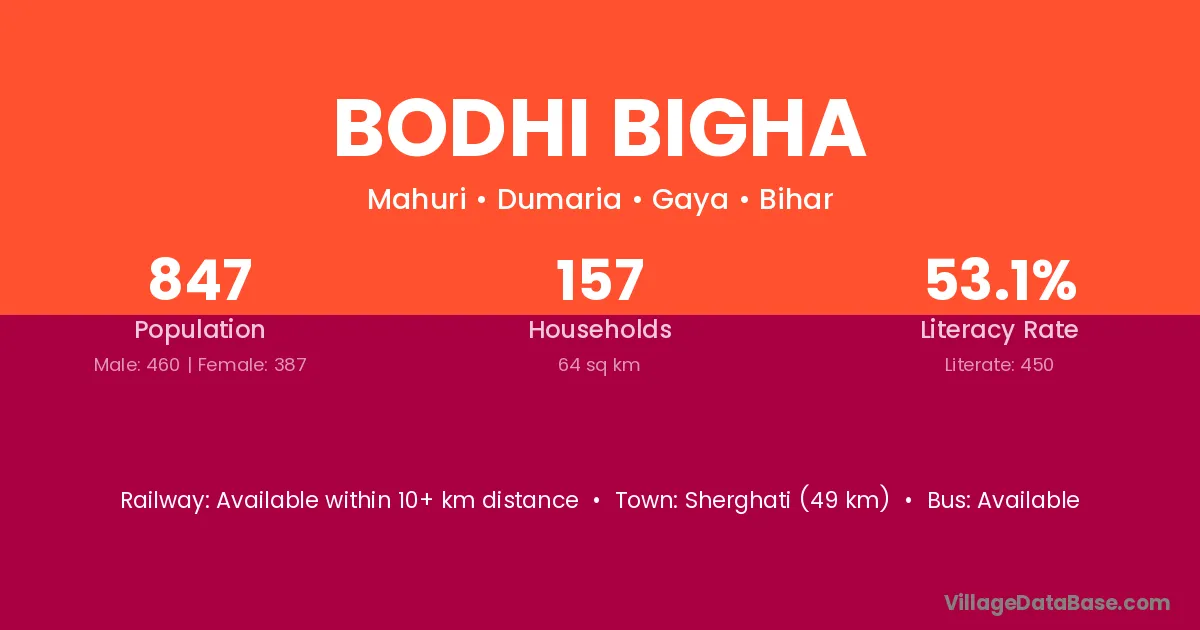 Sherghati (49 km) is the nearest town to Bodhi Bigha village for major economic activities and is located approximately 49 km away.