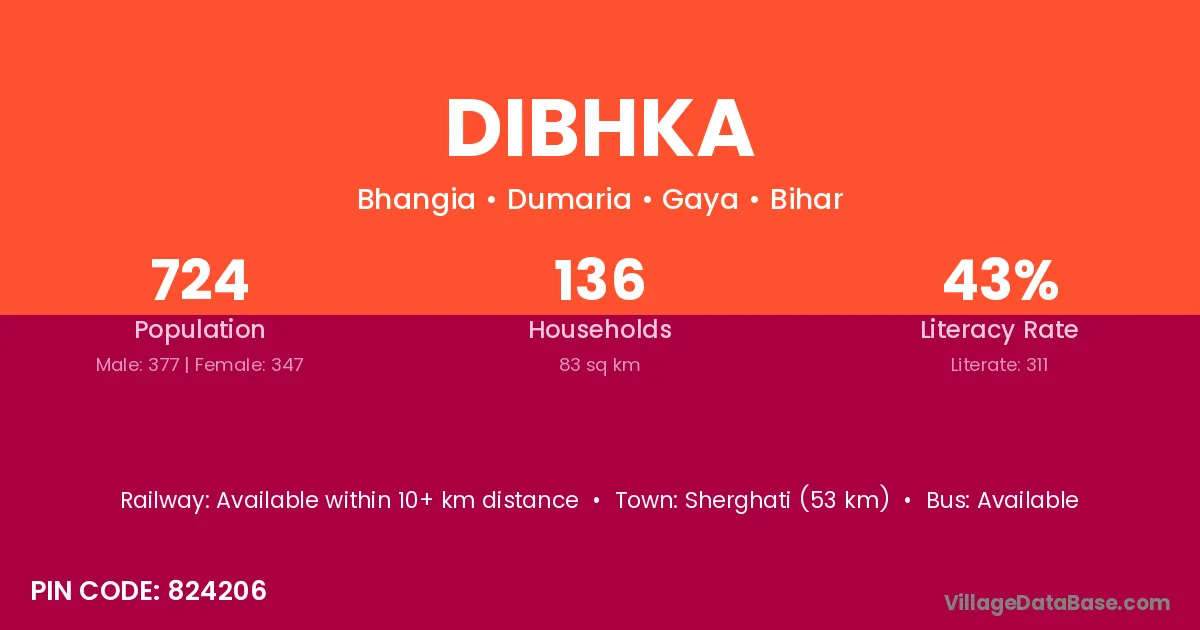 Sherghati (53 km) is the nearest town to Dibhka village for major economic activities and is located approximately 53 km away.