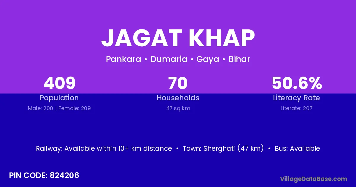 Sherghati (47 km) is the nearest town to Jagat Khap village for major economic activities and is located approximately 47 km away.
