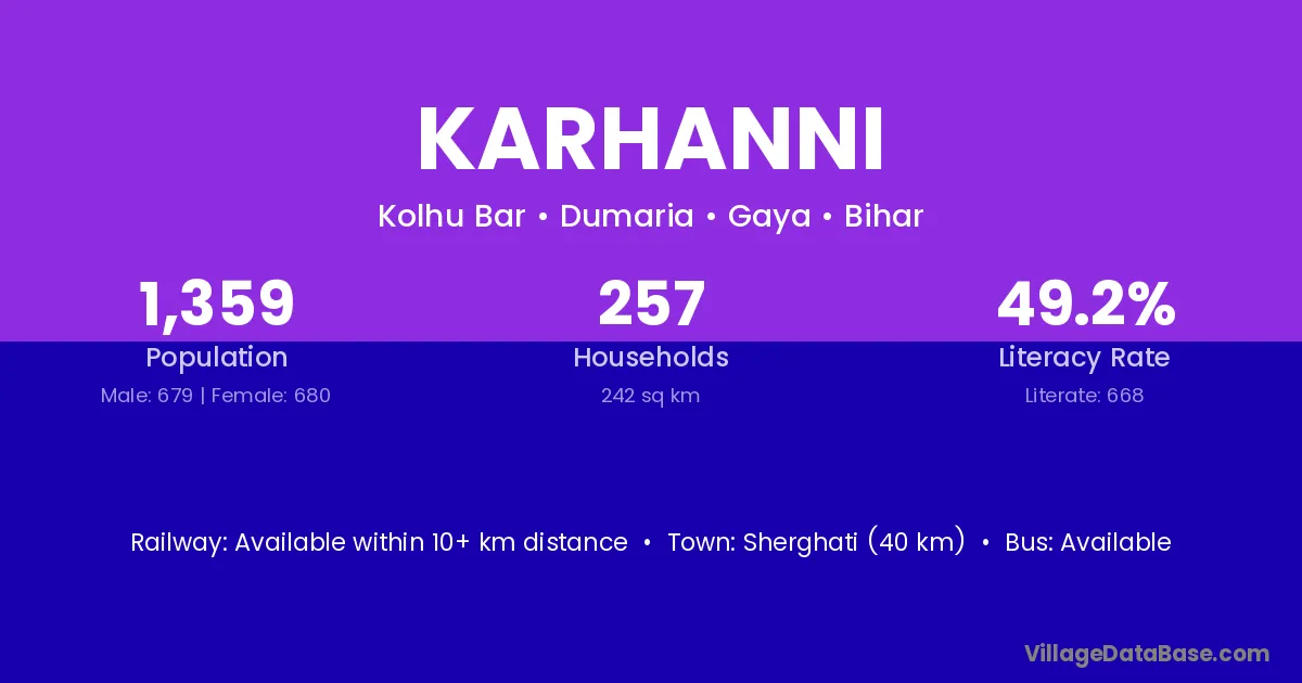 Karhanni village has a total population of 1,359 people, of which 679 are males and 680 are females.