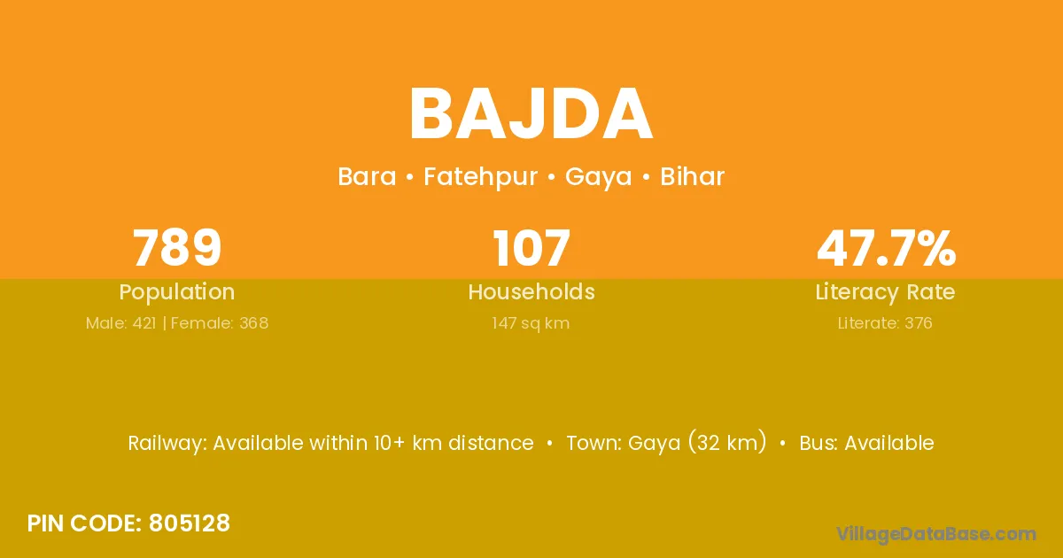 Gaya (32 km) is the nearest town to Bajda village for major economic activities and is located approximately 32 km away.