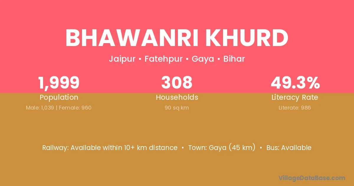 Gaya (45 km) is the nearest town to Bhawanri Khurd village for major economic activities and is located approximately 45 km away.