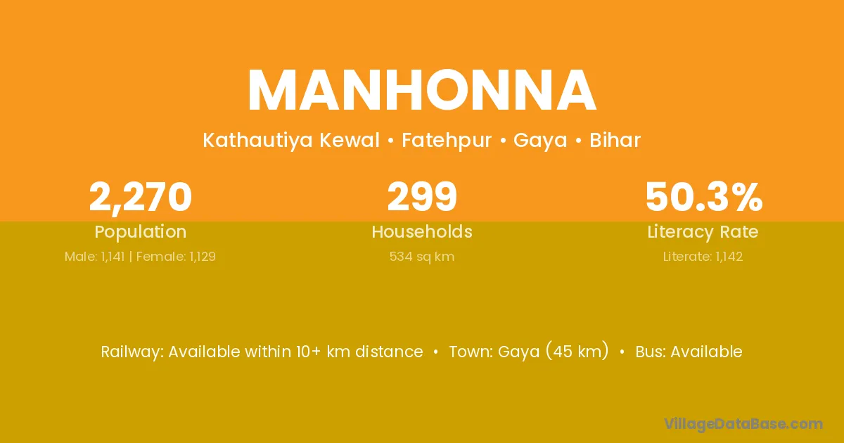 Gaya (45 km) is the nearest town to Manhonna village for major economic activities and is located approximately 45 km away.