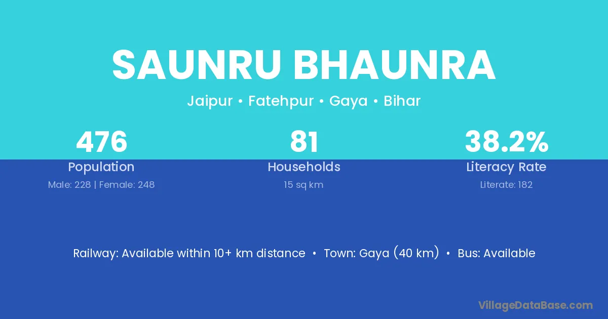 Gaya (40 km) is the nearest town to Saunru Bhaunra village for major economic activities and is located approximately 40 km away.