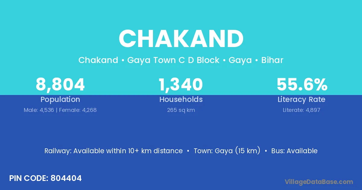 Gaya (15 km) is the nearest town to Chakand village for major economic activities and is located approximately 15 km away.