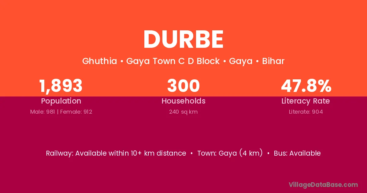 Gaya (4 km) is the nearest town to Durbe village for major economic activities and is located approximately 4 km away.